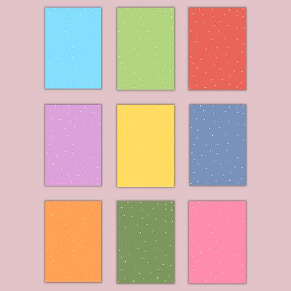 Breng een speels, rustgevend accent in je journal of scrapbook met deze printbare achtergrondpagina's met vaste kleuren en witte stippen. Perfect als basis voor collages, notities of creatieve spreads in junk journals, planners of dagboeken.